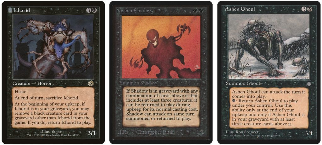 Un peu d’histoire : lorsque l’Ichorid est imprimé en 2002, les créatures à récursion existent déjà depuis longtemps et sont principalement utilisées comme chair à canon, pour payer des coûts d’entretien ou de la discard, tout en s’offrant le luxe de pouvoir taper pour quelques points au passage. Nether Shadow et Nether Spirit ont fait leurs armes comme camarades de jeu de Pox, Skull Catapult, Goblin Bombardment et Contamination par leur faculté à assurer gratuitement une constante présence sur le champ de bataille, offrant un avantage stratégique basé sur l’optimisation des ressources (via une synergie avec le sacrifice) et un avantage tactique par les multiples interactions et manipulations du graveyard qu’elles déclenchent. Ashen Ghoul, plus aggressive mais nécessitant l’investissement en mana en sus d’une condition plus restrictive de déclenchement en fin d’entretien, est une clock pressurisante que sa capacité de résurrection rend particulièrement dangereuse pour l’adversaire après le passage d’une Pox. Krovikan Horror est également un membre de la famille, bien qu’assis sur une autre branche : si son utilisation concrête va différer de celle de ses frères, son mécanisme de récursion reste proche et sa capacité activée est particulièrement synergique avec les sales habitudes du clan fantôme.