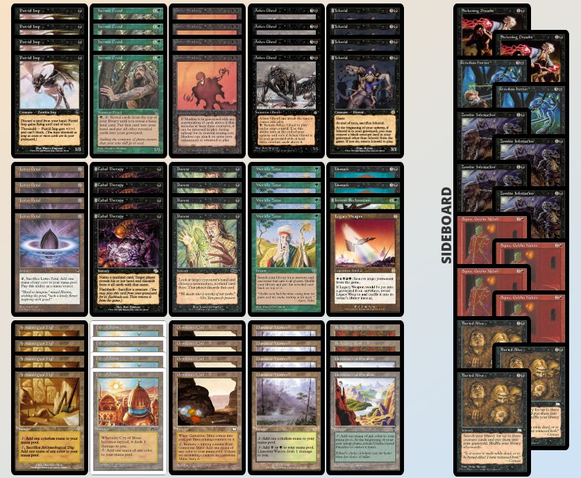 En coupant totalement le bleu et sideboardant l’entièreté du plan Infestation, Ichorid & co se retrouvent à poil et s’en remettent entièrement à l’activation unique du Hermit Druid. Afin de permettre au grand chevelu d’arriver à ses fins le plus rapidement possible, la disruption s’additionne de Duress et Unmask tandis que Lotus Petal et Worldly Tutor accélèrent le plan et que Krosan Reclamation / Legacy Weapon nous permettent de survivre à la meule intégrale garantie sur facture par l’absence des basics. Le résultat idéal est une armée de monstres célérisés qui touche le board T3 et attaque immédiatement pour une vingtaine de blessures, tandis qu’un Putrid Imp recycle inlassablement l’unique Weapon qui nous empêche de mourir, tel le petit mousqueton d’acier lors d’une cascade de glace. Bref, ça passe ou ça casse.