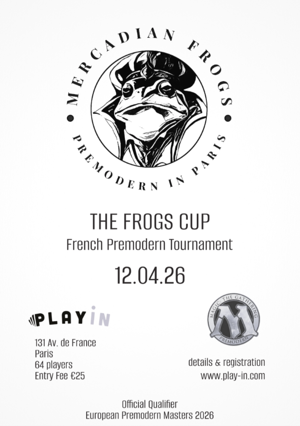 We are proud to announce the very first edition of the Frogs Cup, taking place in April at Playin Paris BNF! Participants will enjoy 6 Swiss rounds of premodern games followed by a single-elimination Top 8. Expect a competitive but friendly atmosphere with lots of fun and iconic plays.